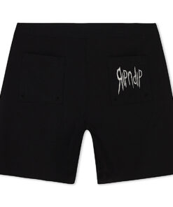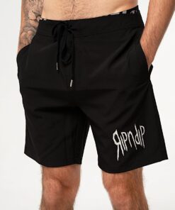 4 Way Stretch Wired Swim Shorts 3 Pockets 92% Polyester 8% Spandex Embroidered Insano Ripndip Logo On Front Adjustable Drawstring Waist Ripndip Patch On Back Pocket Model Wearing Size Medium