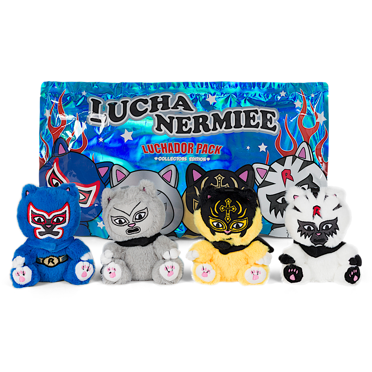 PRE ORDER IS NOW CLOSED! Estimated Ship Date Mid November Lucha Nermiee Mystery Bag Plush Keychains 4 Characters To Collect $22.22 For A Single Mystery Bag $99.99 For Complete Set Of 4 Characters ALL COLLECTIONS ARE LIMITED AND WILL NOT BE REMADE OR RE-RELEASED. DON’T MISS OUT. COLLECT THEM ALL! If Other Items Are On Your Order The Full Order Will Be Shipped Together In November