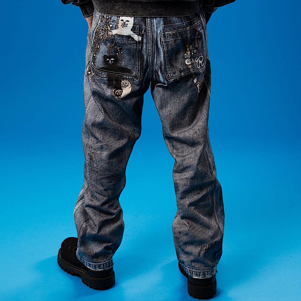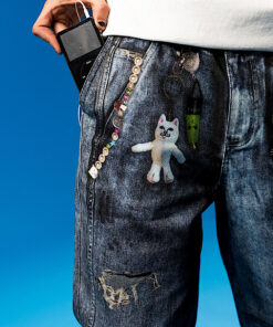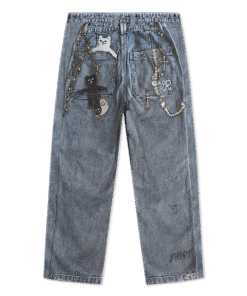 100% Cotton Real Pants Straight leg Denim Pants Fully Printed Denim All Over Print Graphic On Cotton Pants Printed Nerm, Jerm, Ligher Leash, and Keychains Printed On Distress & Holes Embroidered R On Back Pocket 2 Back Pockets YKK Zipper Fly