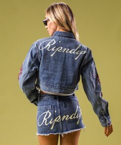 100% Cotton Cropped Washed Denim Jacket All Over Print Travis Graphic Screen Printed and Embroidered Graphics On Front Large Ripndip Logo Across Back