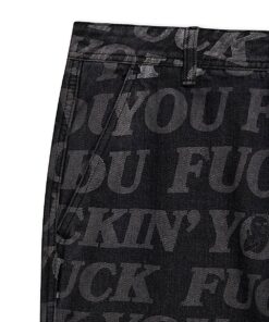 All Over Print Fuckin Fuck Washed Denim Pants Order a size up! YKK Zipper Fly 4 Pockets Button Waist Sizing Chart