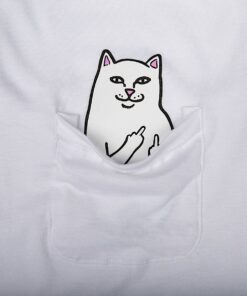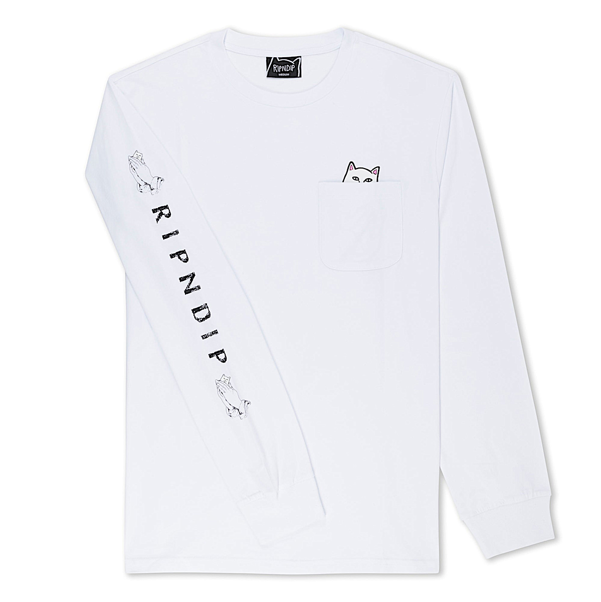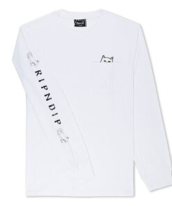 World Famous Ripndip Lord Nermal Pocket Long Sleeve Pull the Pocket Down to see Lord Nermal Flipping You Off Cut and Sewn tee shirt made in the USA Ripndip print on right sleeve 100% Cotton