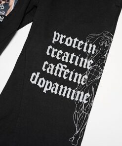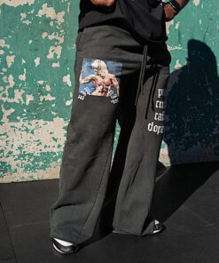 500 GSM 100% Cotton Custom Made Baggy Sweatpants Drawstring Waist Cut Hem At Bottom Screen Printed Artwork On Both Legs Zipper Close Side Pockets One Back Pocket