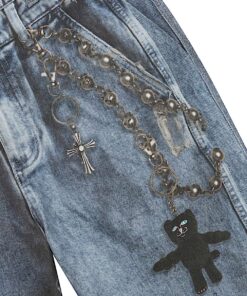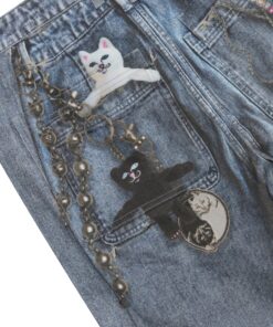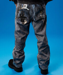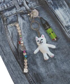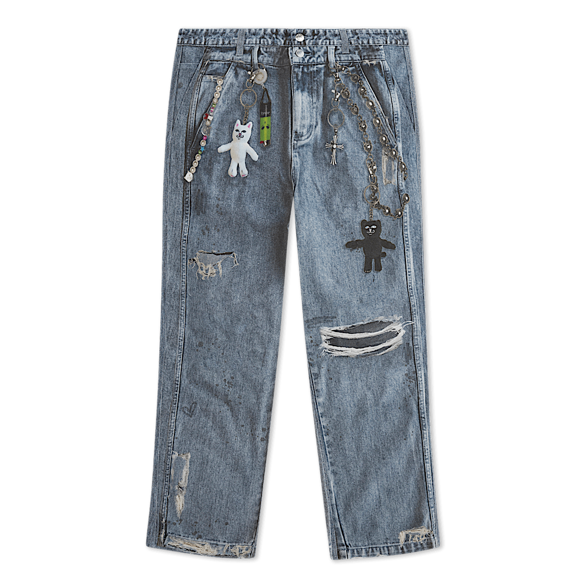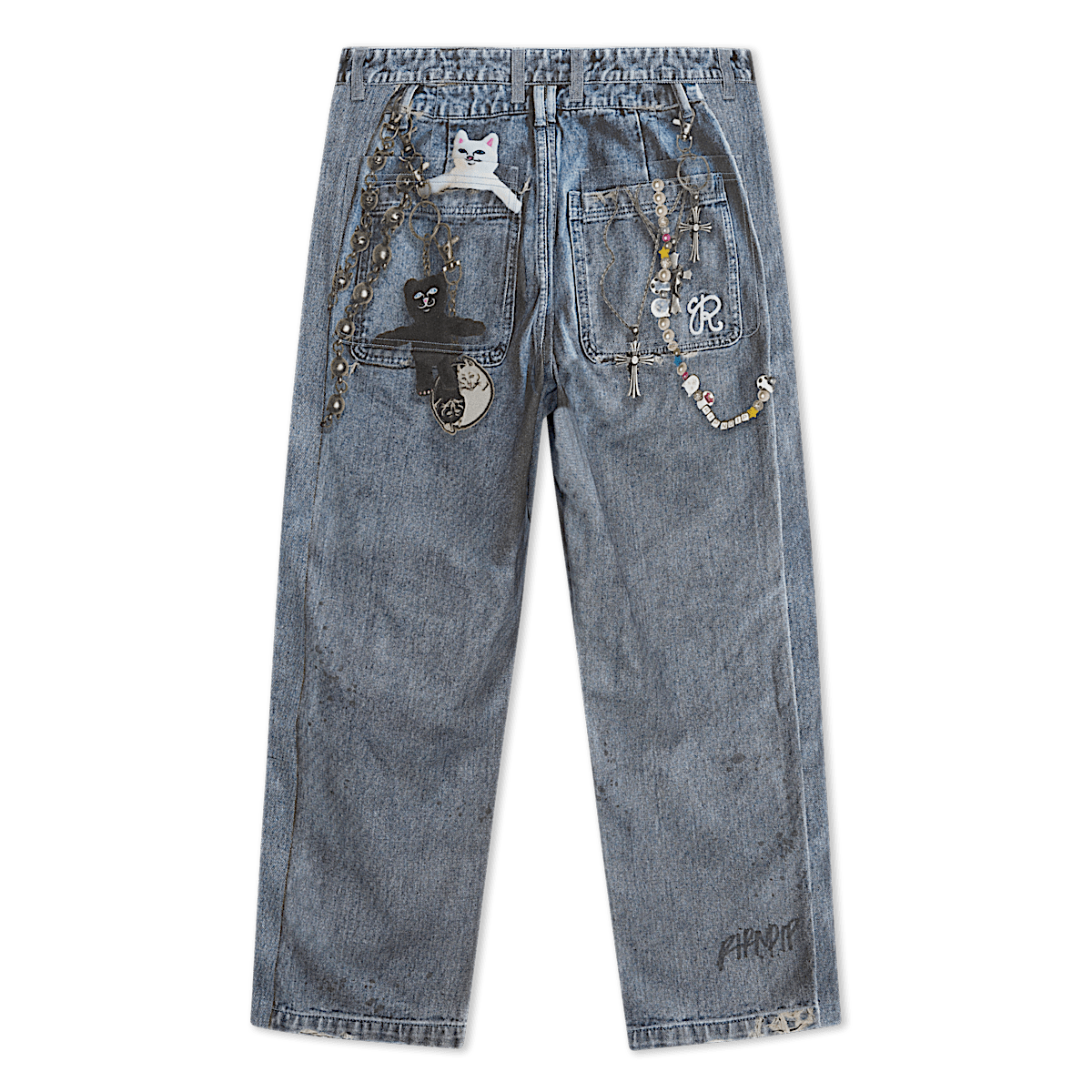 100% Cotton Real Pants Straight leg Denim Pants Fully Printed Denim All Over Print Graphic On Cotton Pants Printed Nerm, Jerm, Ligher Leash, and Keychains Printed On Distress & Holes Embroidered R On Back Pocket 2 Back Pockets YKK Zipper Fly