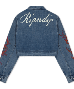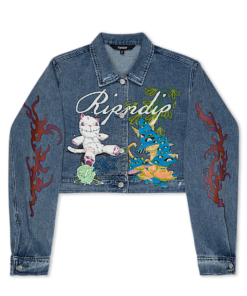 100% Cotton Cropped Washed Denim Jacket All Over Print Travis Graphic Screen Printed and Embroidered Graphics On Front Large Ripndip Logo Across Back